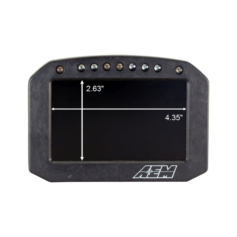 AEM CD5 Carbon Flat Panel Digital Displays are perfect for flush mount installation or in-dash enclosures with tight tolerances. They include all of the robust features found in the original CD-5 Carbon car dashboard monitors, but do not have buttons or an LED shade hood built into the enclosure. AEM CD5 Carbon Flat Panel Digital Displays feature full-color, daylight readable screens surrounded by a slim, tough, lightweight flow-molded carbon fiber composite housing. Seven ultra-bright LEDs span the top of the display housings for RPM and shift light indication. Users can program them to ascend in specific increments based on RPM range and flash when it is time to shift. Brightness is user programmable on the fixed color LEDs. A remote button kit (PN 30-3610, sold separately) easily wires into the CD Carbon wiring harness and allows users to change pages and clear memory. Two additional programmable LEDs are included in the car dashboard monitor's enclosure and are fully programmable
