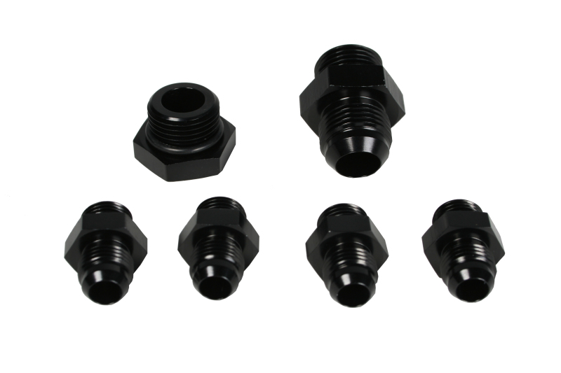 For Regulator P/N 13202 in dual carburetor setups. Contains: (4) AN-06 to AN-06 Male Flare Fittings, (1) AN-10 to AN-10 Male Flare Fittings, (1) AN-10 Port Plug. More area and smoother transitions from the inlet to the outlet, resulting in less restriction than any other fitting line. The Aeromotive line of custom fittings, adapters and hose-ends are a step above the norm, offering uncompromised fuel flow and positive sealing. Constructed of 6061 T6 aircraft grade aluminum or stainless steel, each component is CNC-machined for precision fit and unmatched flow. All billet aluminum fittings are anodized Type II bright dip black for corrosion protection and unrivaled aesthetics. We offer a complete line of hard to find fittings from OEM specific connections to AN adapters.?All Aeromotive fittings and adapters are fully compatible with gasoline and alcohol based fuels.