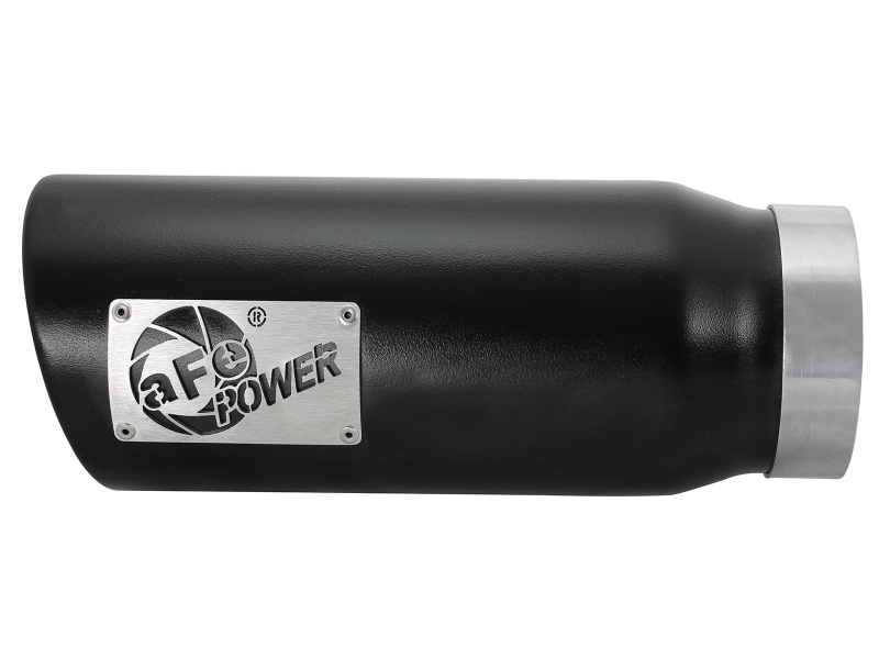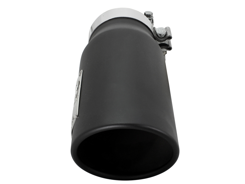 Upgrade your dual exhaust system with our MACH Force stainless steel, universal bolt-on tips designed to fit most 4" exhaust systems. Sold in pairs, these 12" long, single-walled, angle cut black finish exhaust tips feature a brush finished, laser-etched aFe POWER logo for a custom look. Completely adjustable, the tip set includes quality stainless steel ba nd clamps for a secure fit. Dimension: 4" inlet x 5" outlet and 12" length.