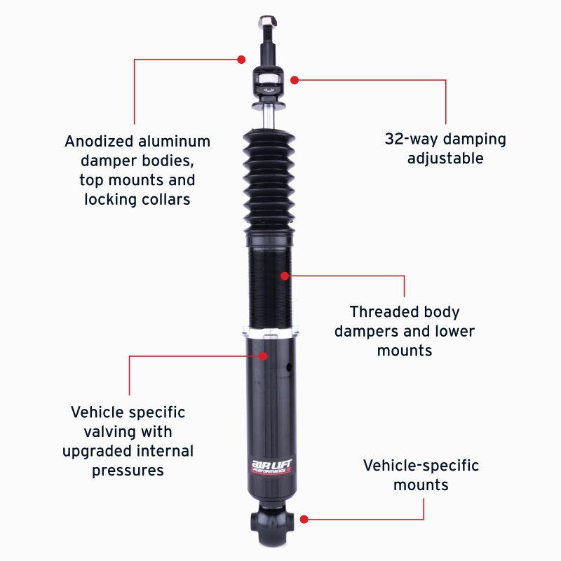Get the perfect stance for your Audi or Volkswagen with Air Lift Performance’s rear air spring suspension kit. This kit lowers your suspension without sacrificing ride quality. The Audi/VW rear kit features progressive-rate, double-bellows air springs over high-performance monotube and threaded-body shocks. With 32 levels of damping adjustability and threaded lower mounts, the shocks allow for full tuning. Together, these components offer exceptional comfort, performance, and a drop of up to 5.4” (137mm) from stock in the rear. Air Lift Performance stands behind every product with over 70 years of suspension experience. With a one-year, unlimited mileage warranty and dependable customer support, this kit gives you the confidence to roll low.
