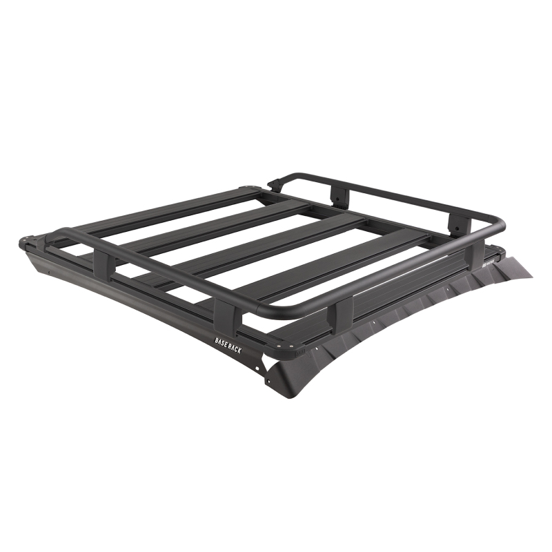 The BASE Rack takes accessories and cargo loading to a whole new level of simplicity, speed, and personalization. The BASE Rack is fully-welded aluminum for lightweight strength that doesn't flex under load. It can therefore be mounted close to the vehicle roof for a slimline aesthetic and reduced drag. Its dovetail extrusion attachment system runs the full perimeter of the rack and along each internal beam providing endless mounting and attachment options. Adding, removing, and repositioning accessories and roof loads is quick and easy and individual items may be installed or removed without disturbing the whole load. Unlike traditional roof rack channels, the BASE Rack dovetail system doesn't collect dust and debris. This kit includes a 49 in (L) x 45 in (W) BASE Rack, mount kit with wind deflector to suit the Toyota Tacoma along with three-quarter guard rails. The rails attach quickly and easily to the dovetail extrusion around the rack's perimeter with some additional fixing points at the rack corners. A cross between full and trade rails, three-quarter rails, along with an optional roller kit, assist with easy rear loading of large and awkward items while still providing load security at the front and sides of the rack.