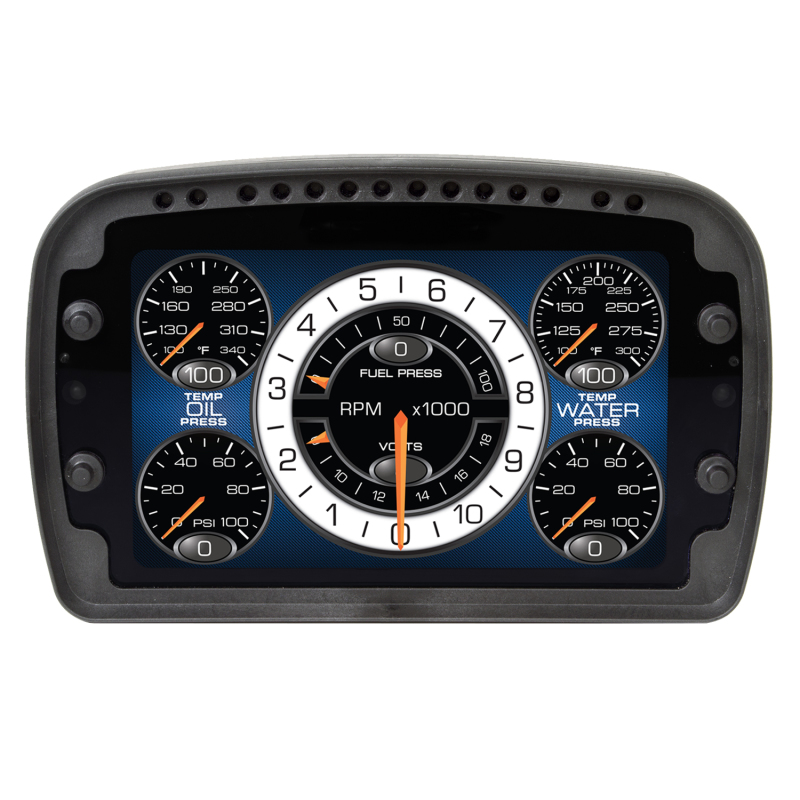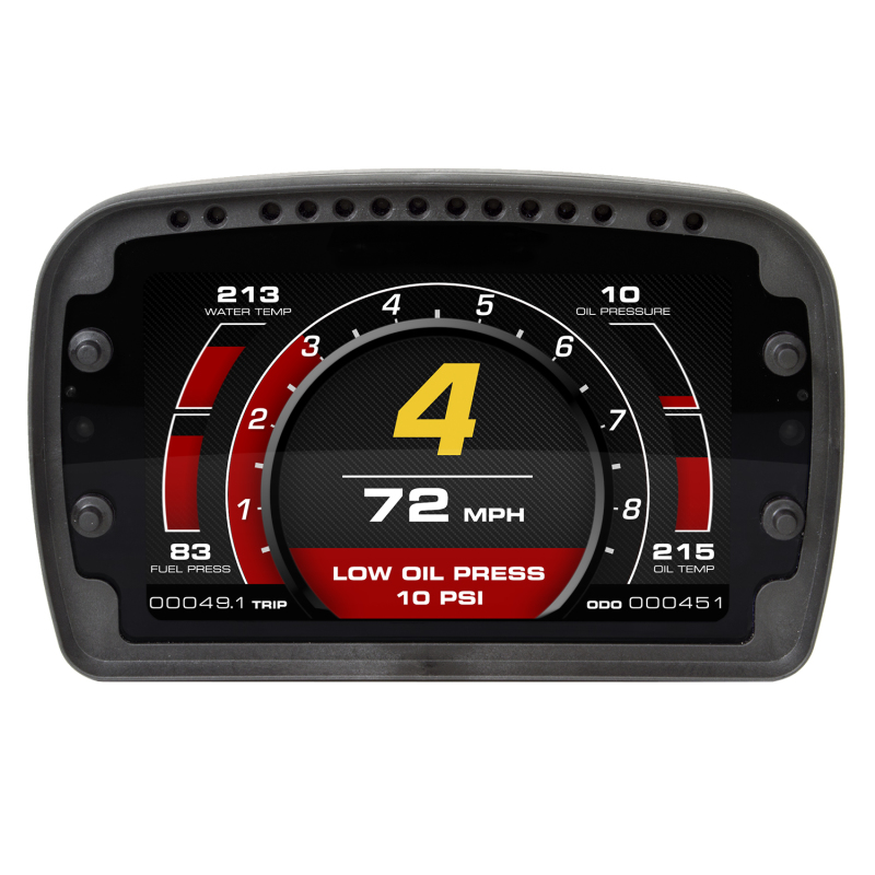 The AutoMeter Competition LCD Display is the next evolution of driver communication and data acquisition. Designed specifically for the harshest of environments, the carbon composite housing is IP65 sealed against water and dust intrusion and will easily withstand 20g of continuous vibration and 50g of shock. Our 7" LCD panel ensures easy visibility under all circumstances with a retina level pixel density, unmatched brightness and an optically bonded lens for extreme glare suppression. The display layout is fully configurable to your individual specifications. The system will accommodate four programmable data bus channels (2 CAN and 2 serial) in conjunction with a nearly limitless amount of discrete analog sensors and its integrated 3 Axis Accelerometer. Data collection can occur at up to 1 kHz and the internal memory allows for practically infinite recording time. User definable warnings take advantage of super bright, multicolor LEDs placed around the perimeter of the chassis to alert the driver to critical onscreen information.