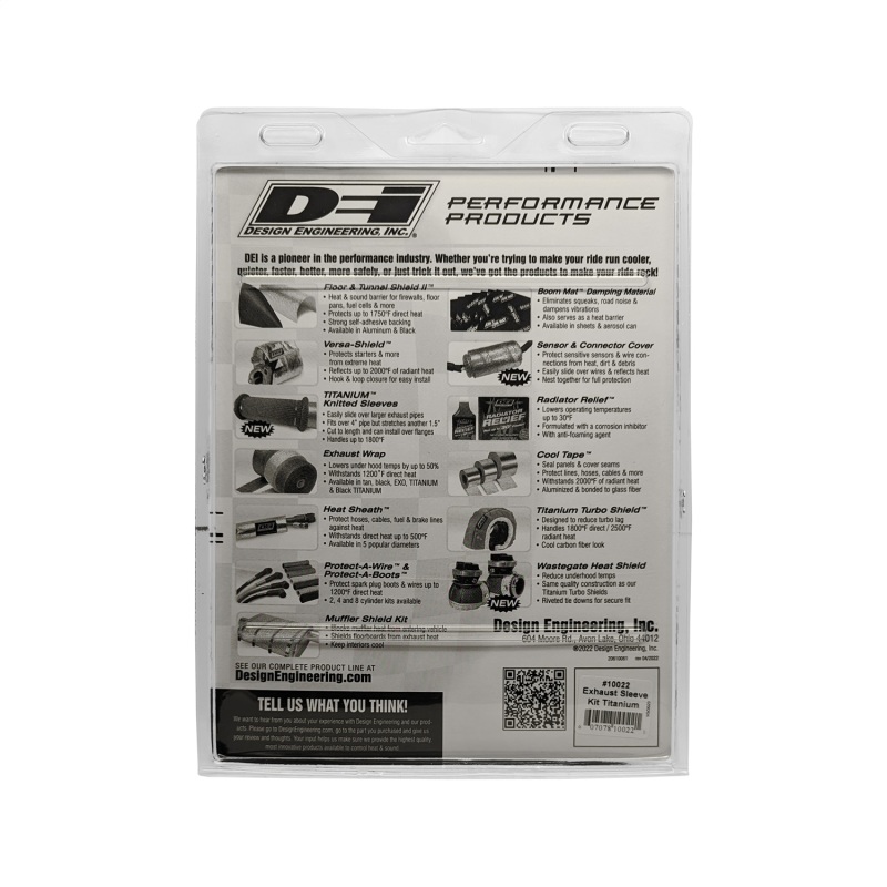 It's hard to believe, but not everyone likes the look of exhaust wrap. But despite different visual tastes, we haven't met any customer that likes getting burned by a hot exhaust pipe. DEI now offers a our premium Titanium material in the form of a sleeve. This great looking alternative to traditional wrap satisfies the eyes while offering the same amount of insulation and protection. To fit properly the pipes must not have any welded brackets or fittings allowing the sleeve to slide over the end of the pipe. Each kit includes four of our stainless steel locking ties and tie tool to ensure a secure fit. NOTE: Wrapping of the catalytic converter is not recommended, as overheating can lead to reduced lifetime of the converter. Instead, try our Corvette Catalytic Converter Shield or create your own shield using our Floor & Tunnel Shield II(TM). Universal 2 in. diameter sleeving x 5' Two (2) - 1/4 in. x 9 in. stainless steel positive locking ties Two (2) - 1/2 in. x 9 in. stainless steel positive locking ties One (1) Locking Tie Tool included
