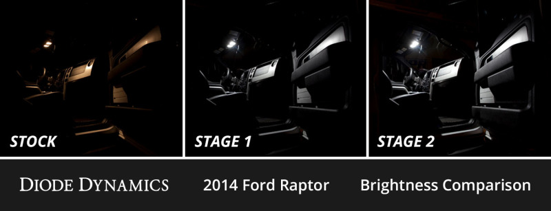 Features Add a modern, cool white appearance. Increased output with LED bulbs. Includes LED replacements for all interior incandescent bulbs. Plug-and-play, simple installation. Overview Increase your light output and add a modern appearance to your vehicle with our Interior LED Conversion Kit compatible with Ford Raptor! Factory interior lighting leaves much to be desired with a dated appearance and lackluster performance. By replacing your outdated halogen bulbs with LEDs, you’ll give your vehicle a more modern appearance, and significantly increase the output of your interior lighting. Modern Appearance. The LED bulbs included in this kit feature a 6000K true cool white output without any blue - just like factory installed LEDs. This provides a serious upgrade in the overall appearance of your interior when compared to the factory halogen bulbs. All Diode Dynamics LED bulbs are tested in-house, so you know you’re getting consistent performance. Brightness. This kit is available in two levels of brightness, Stage 1 and Stage 2. Stage 1 gives your interior an ultra-modern appearance, while providing a slight increase in output compared to your factory lighting. Stage 2 steps things up with a significant increase in overall light output throughout the interior. Plug-and-Play. The LED bulbs included in this kit feature plug-and-play connections for simple installation. Our bulbs are not constructed with cheap connectors, so you don’t have to worry about them coming loose and falling out. Simply remove your factory bulbs and these will fit right in place! Two plastic trim removal tools are included to assist with installation. If any bulb does not light up when you turn it on, simply remove the bulb, rotate it 180 degrees and reinstall.