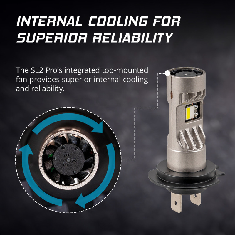Features Advanced TST LED Technology for industry-leading performance. Internal cooling for superior reliability. Fully integrated design, no wires or external drivers. Direct replacement bulb with compact fitment. Backed by limited lifetime warranty. Designed and engineered in USA (Patents Pending). Introducing the SL2 Pro LED Bulb! As a replacement for the popular SL1 LED bulb, the new SL2 Pro LED features some major upgrades: next-generation TST LED technology, an integrated top-mount fan, and a fully-integrated, wire-free design. As a direct plug-and-play replacement, it provides a significant increase in output, in a compact package. Next-Generation TST Technology. The SL2 Pro features new thermal separation technology (TST) LEDs. TST LEDs are designed with electrical connections on the top which lowers thermal resistance, allowing the SL2 Pro to run at higher power levels than traditional LED bulbs, while maintaining focus. Correct Optical Focus. The SL2 Pro LED bulb was engineered to focus light just like your original bulb, matching the original beam pattern while providing an increase in total output. Instead of using the smallest LEDs possible which can lead to streaks, lines, and harsh cutoffs, the SL2 Pro was optimized to provide a smooth beam pattern, while maintaining focus. Internal Cooling. The SL2 Pro features an integrated top-mounted fan which provides maximum cooling efficiency, superior thermal management and long-term reliability. Since the fan is sealed inside the housing, there's no concerns about damage from dust or moisture over time. NOTE: LED bulbs are legal in the USA for Fog Light use only. Not compliant with DOT / FMVSS108 and not street legal in the USA for Headlights. International legality varies by country.