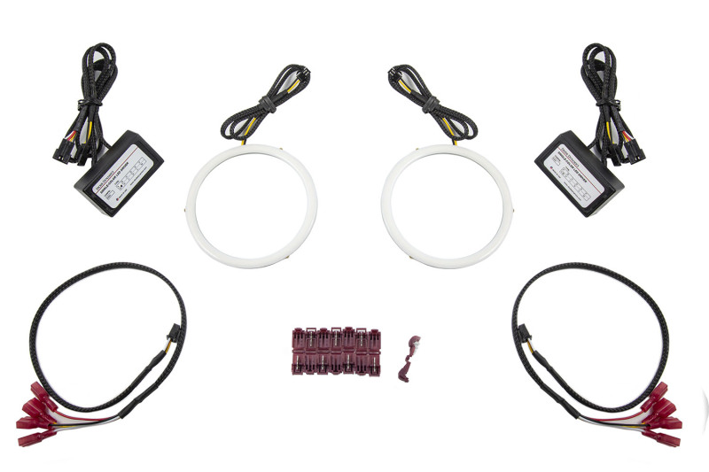 Features Proprietary durable phosphor coating, to create uniform, solid appearance. Extremely bright, high-density LEDs that are visible even in direct sunlight. Multi-function PWM drivers, fully waterproof, featuring low power, high power, and turn signal modes. Integrated mounting tabs for easy installation. Overview The white and red wires both activate the color of the LEDs, at different brightness levels. Your order includes "low priority" drivers by default, meaning that if both wires are powered, low power will take priority. This is convenient for connecting the red wire to a parking light or DRL signal, for use during the day as a high-power DRL. Then, if the white wire is connected to the headlamp power, they will dim down at night. Of course, this is completely optional, and you can just use one of the input wires if you'd like. The signal wire will output even higher power to the ring, so it cannot be run constantly, or the driver will overheat. It should only be connected to a turn signal. If you'd like amber for a running light, please select the single color amber rings instead. What's Included Two (2) HDLED Halos Two (2) waterproof drivers Two (2) input wire pigtails with T-taps Installation guide 3-year replacement warranty