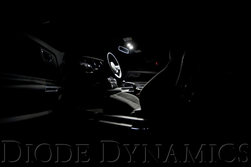 FeaturesIncludes all the LEDs you need to replace the interior incandescent bulbsIncreased output with LED appearancePlug-and-play simple installationAvailable in multiple colors and brightness levels.OverviewUpgrade. This Interior LED Conversion Kit is compatible with the Ford Mustang and gives your vehicle a more modern appearance. This kit includes all the LEDs you need to replace the factory map vanity glove box and trunk incandescent bulbs. These bright LEDs are available in a number of colors including cool white red blue and green to match your unique style.Brightness. This kit is available in two different brightness levels. The Stage 1 option is a good choice if you're looking for a simple change of color and slightly brighter output than your factory bulbs. For the highest increase in light output from your factory bulbs we'd recommend the Stage 2 option!All Diode Dynamics LED lighting is rated with accurate measured lumen figures not calculations or guesses. We test the true output in-house and provide you the real numbers to compare.Reliability. Unlike other bulbs on the market Diode Dynamics LEDs are built with constant-current inductive circuitry along with transient suppression. While more expensive than simple bulbs this allows Diode Dynamics LEDs to last for years with no flickering or failure.What's IncludedFour (4) 74 SMD1 Vanity Light BulbsTwo (2) 194 Map Light BulbsOne (1) 194 Trunk Light BulbOne (1) 194 Glove Box Light BulbInstallation Guide