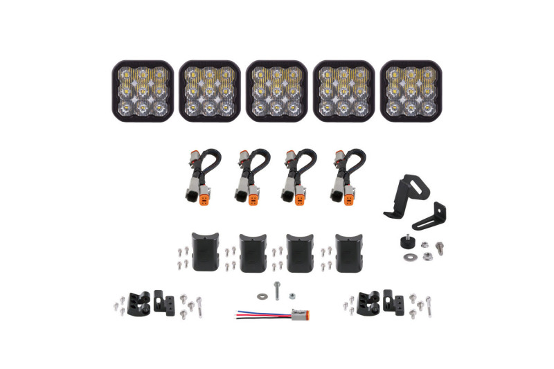Features Five-pod 31.5-inch linked lightbar Engineered TIR (total internal reflection) optics Selectable backlight color, with eight color options Torture-tested, heavy-duty construction Ultra-high intensity: shines almost a mile away Assembled in USA Overview Using our patent-pending CrossLink technology, this kit links five SS5 LED pods together into a single lightbar. Featuring the highest output intensity of any 5-inch LED pod on the market, the LED pods included in this kit have been designed for maximum functionality, with custom-engineered TIR optics, all in a durable package. Focused. Traditional optics like reflectors or simple lenses lose light internally and to glare, so not all of the light shines on target. Instead, the custom-engineered TIR optic in the SS5 collects all of the light from the LED, and directs it only where you need it, drastically reducing glare and improving total efficiency. Selectable Backlight. The Stage Series 5inch LED Pods included in this kit feature a selectable backlight with eight different color options. Selecting your backlight color is easy - simply alternate the power on and off. There’s no complicated programming with a controller! The SS5's backlight fully illuminates the TIR optic, providing unique accent lighting that you won't find on other LED pods. NOTE: Due to the yellow lens, the Yellow kit is only available with an Amber backlight color. Simple connections. All SS5 LED pods feature a custom-molded DT type Deutsch-style connector. A DT wiring harness is included in the kit to connect the pods together, along with a 6-inch pigtail with bare leads. For installation, you can wire yourself, use an off-the-shelf Deutsch DT sized wire harness, or use a Diode Dynamics wire harness.