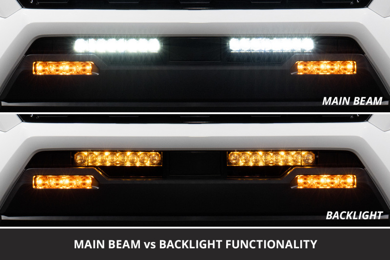 Features Patented TIR Optics for maximum efficiency and output. Upgraded beam patterns engineered for real-world performance. True amber backlight provides unique accent lighting. Durable aluminum housing with ASTM-standard powdercoat finish. Built for the extreme with IP69K waterproof rating. Overview The Stealth LED Light Bar Kit compatible with Toyota Tacoma 2024+ adds powerful auxiliary lighting with a clean, OEM-style appearance. These application-specific brackets have been CAD-designed to mount two 10-inch LED Light Bars behind the grille using factory mounting points. No cutting or drilling required! With higher light output, modern optics, and greater intensity than anything else on the market, the new Stage Series Lightbars are the most capable lightbars available today! Choose Your Look. Brackets are compatible with any generic 30" LED light bar if you prefer to upgrade or swap bars in the future. Designed for Performance. Each Stage Series Light Bar has been engineered from the ground to provide more output than any other light bar on the market. Unlike reflectors, TIR optics capture and focus nearly all of the light output, shining it only where you need it, without glare or wasted light. Amber Backlight. All Stage Series LED Light Bars include an integrated amber backlight that fully illuminates the TIR optic, providing distinctive accent lighting and enhanced visibility when parked or stopped on the trail. The Sport model offers the best bang for your buck, while the Pro model takes things a step further with a noticeable boost in power. The Max model is designed with cutting-edge automotive emitters for both high power and extreme intensity.