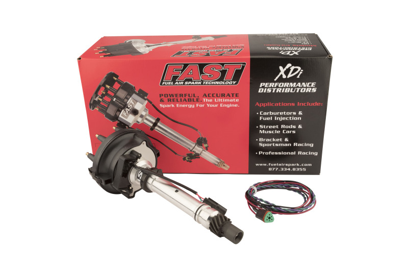 The FAST XDi Sportsman Distributors were designed to deliver the most accurate trigger signal possible throughout the entire RPM range of your race engine. This is accomplished through the use of an advanced Hall-effect style pickup which is then converted to a signal that most CD ignition controls accept. The benefit of a Hall-effect pickup is there is no retard, commonly called magnetic pickup compensation, so you can ensure your timing remains stable from idle to race RPM. Inside the CNC-machined billet housing is a polished stainless steel shaft that is supported with sealed ball bearing on the top and a long bushing on the bottom. FAST also has gone through great strides to reduce end play in the distributor to take out any timing variations and damage to the gear. Each distributor is supplied with a high-quality rotor and distributor cap. A FAST Ignition Control (E6 or E7 series) must be used. Note that there is no mechanical advance, the timing is locked out. XDi Sportsman Distributors are available with a large diameter Ford style cap or smaller diameter GM points size cap with HEI terminals.
