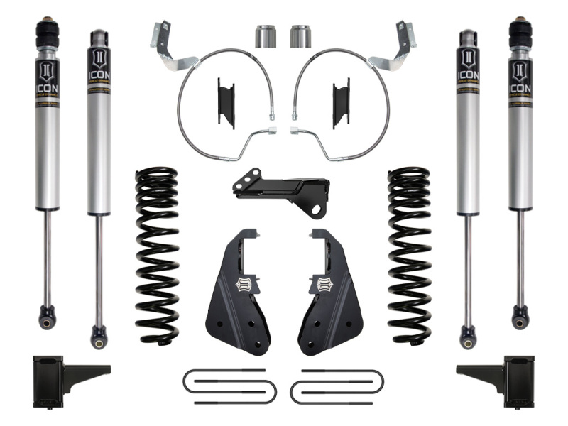 ICON's 4.5" Stage 1 System is comprised of 4.5” lift coil springs optimized for trucks equipped with diesel engines with a dual rate design that allows for a softer initial rate for superb on-road comfort and a firmer secondary rate that increases during compression for excellent bottoming resistance and off-road performance. Fabricated radius arm drop brackets correct suspension geometry and ensure proper wheel alignment with the OE radius arms. The fabricated track bar drop bracket allows the axle to be properly centered under the frame and reduces road feedback throughout the steering system with improved on- and off-road manners thanks to the elimination of bump steer. Heavy-duty fabricated 5" rear blocks and U-bolt kit lift the rear of the vehicle and are designed to withstand heavy towing/hauling duty as well as the stresses of aggressive off-road use. ICON 2.0 Aluminum Series internal reservoir front and rear shocks feature a vehicle specific tune for improved vehicle handling and excellent ride quality on- and off-road. The included box kit includes fabricated front sway bar drop brackets to prevent bind, heavy-duty aluminum bump stop spacers, and high quality stainless steel extended brake lines.