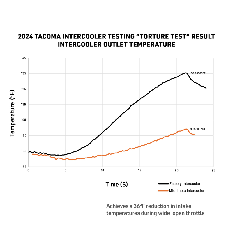Give your 2024+ Toyota Tacoma the cooling performance it needs with the Mishimoto Performance Intercooler. Built to preserve horsepower under demanding conditions, this bar-and-plate core resists heat soak and lowers intake temperatures by up to 36F during wide-open-throttle pulls. With a 55% larger core volume than stock, it provides more consistent power across the RPM range while improving top-end charge air cooling. -- Reduced pressure drop and optimized airflow allow your turbo to work more efficiently, keeping engine performance steady under heavy loads or off-road conditions. Cast end tanks deliver strength and flow, anodized ORB ports ensure reliable sensor connections, updated mounting bushings add durability, and a new crush washer is included for the temperature sensor to ensure a proper seal. -- The intercooler integrates seamlessly with OEM and Mishimoto components, including the Mishimoto Performance Aluminum Radiator, supporting future upgrades and maximizing cooling efficiency. Choose between a sleek silver or stealth black powder-coated finish to suit your build and provide a clean, polished look. Backed by the Mishimoto Lifetime Warranty, this intercooler gives your Tacoma reliable performance and confidence wherever the road or trail takes you.