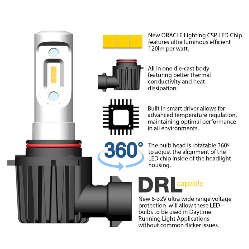 Looking for a bright, versatile, and easy to install LED Headlight Conversion Option The new ORACLE Lighting V-Series packs a ton a features to make it not only user-friendly but also an amazing value with the all-new design technology. The V-Series bulbs feature fcCSP Flip-Chip Scale LED Packaging. The advantages of flip-chip technology provides enhanced electrical performance over standard wire bond technology, allows for a smaller form factor due to increased routing density, and eliminates wire-bond loops. An ultra-luminous and extremely efficient light output with superior durability and reliability. This new all-in-one diecast body design mimics the look of the original factory halogen bulb. The die-cast design also provides increased thermal conductivity and heat dissipation to insure long bulb life. V-Series LED bulbs offer even more compatibility by working with vehicles that use the headlight bulb for the DRL function at a reduced voltage. The class-leading 6-32V ultra-wide range voltage protection will allow these LED bulbs to be used in Daytime Running Light Applications without common flicker issues. ORACLE Lightings new V-Series bulbs feature our SmartDrive Active Thermal Regulation temperature management. The integrated constant current linear LED driver inside the bulb uses a system called thermal foldback to protect the LEDs and the bulb components. The LED driver operates from a 6V to 24V input and offers constant current output at up to 1 Amp. If the bulb becomes hot and surpasses optimal working temperature, the driver can reduce the current by altering the PWM duty cycle until temperature stabilizes. Supplementing passive thermal management with active techniques such as this allow for a very small bulb package without risking damage to the LED or creating an environment where the LED lifetime would otherwise be significantly shortened. Although reducing the current reduces luminosity, the current reduction is minimal.