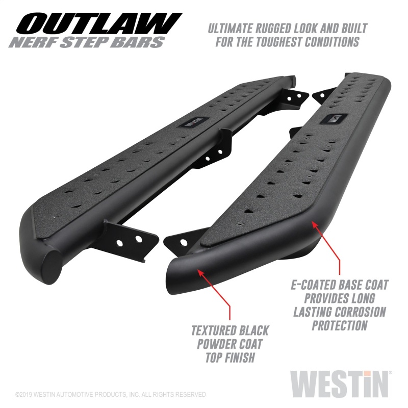 Westins Outlaw Nerf Step Bars offer the perfect balance between function and strength resulting in the ultimate rugged look designed to last and impress. Engineered to fit tightly against rocker panels, the Outlaw Nerf Step Bars provide a solid fit and superb protection while simultaneously improving vehicle cab access. Whether you are an avid overlander or simply an off-roader, rest assured you will be safely stepping into your vehicle with a 16 gauge steel coarse step surface and 2in. diameter tubing. Featuring bolt-on installation, an e-coated base coat and textured black powder coat top finish, Westins Outlaw Nerf Step Bars are the ideal match for the toughest of conditions.