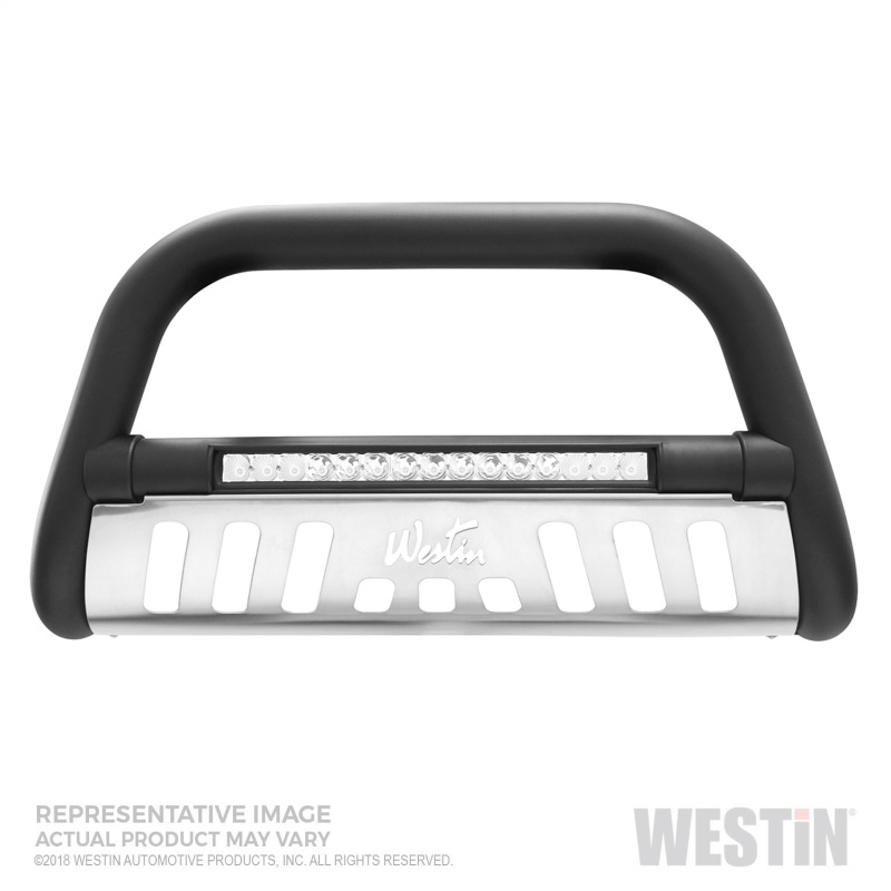 Westins Ultimate LED Bull Bar will take your truck to the next level with this cool new look! The integrated light bar is a 20 single row with 15 x 3 Watt Osram LEDs. The LED light bar is flush mounted in the center cross tube and weather sealed for moisture resistance. Built with 3 steel tubes, our Ultimate LED Bull Bar features molded transition bushings and a brushed stainless steel skid plate for a perfect look. The product is available in chrome plated stainless steel backed by a lifetime warranty, and in textured black powder coat backed by a 3-year warranty. Make a bold statement with Westins new Ultimate LED Bull Bar and give your truck the durability, look and style it deserves.