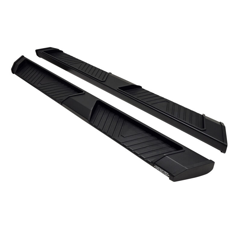 AT6 Running Boards are designed for full size trucks and feature a 5-inch wide step area with integrated indented pads for solid footing. Built with clean, rounded end caps and bracket covers for an OEM?style appearance, they offer a refined yet rugged look. Two finish options are available, textured black powder-coated extruded aluminum, backed by a 3?year limited warranty, or bright finish polished stainless steel with a limited lifetime warranty. These boards are lightweight but structurally durable, designed to minimize added weight with the strength for the toughest jobs. The footboard and pads are ergonomically placed for comfort and maximum traction. Bracket covers are used to conceal mounting hardware and help preserve that clean factory look. The AT6 models are vehicle-specific fit and include hardware to bolt on the boards with no drilling required. Installation takes about 1.5hrs, and depending on the height of the truck, should not require a lift. The aluminum construction offers excellent weather resistance with proper care and maintenance, but for harsh road conditions or regions where salt is used on the roadways during winter, choose stainless steel. Replace your factory running boards with AT6. They are a sleek, solidly built option with stylish design, ample stepping area, and finish choices for a custom look.